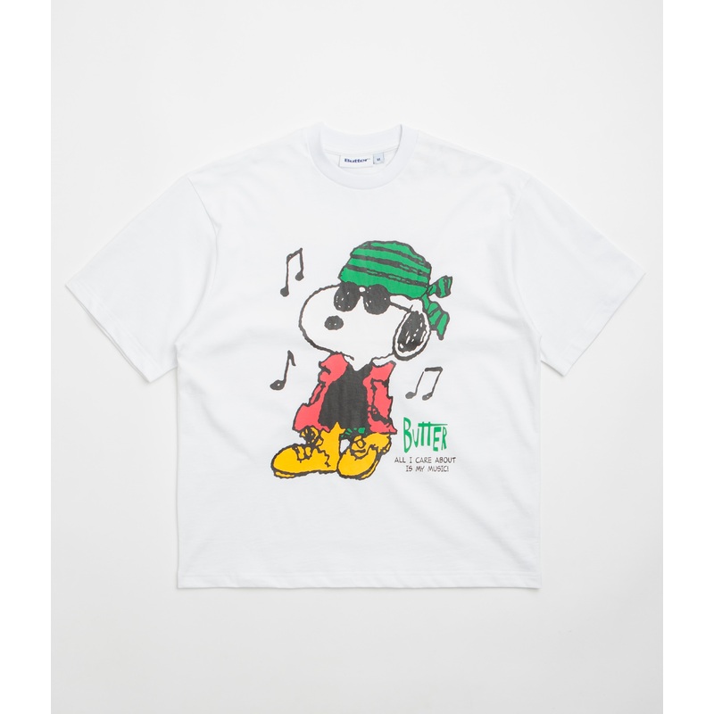 Butter Goods x Peanuts Music T-Shirt in White. Made from 100% cotton, this block tone Butter Goods t-shirt arrives as part of the brands Peanuts collection. Featuring a rib knit collar and a straight hem, this white Butter Goods t-shirt is finished with a screen printed graphic.