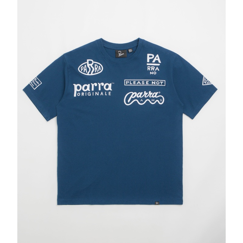 Made from 100% cotton, this blue t-shirt brings graphics to every angle with prints on the front, back, and sleeves. The ribbed crew collar and regular fit keep it comfortable and easy to wear, while a woven label adds a subtle finishing touch. A bold, by Parra tee with all-round details.