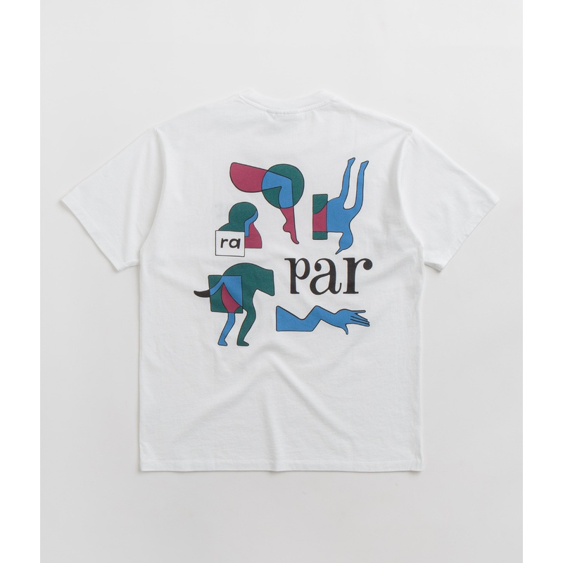 by Parra Rug Pull T-Shirt in White. Tailored to a regular fitting from 100% cotton, this colour block by Parra t-shirt is designed with a flexible rib knit collar and a flag labelled hem. Finished in a shade of white with embroidered chest branding and with printed rear artwork.