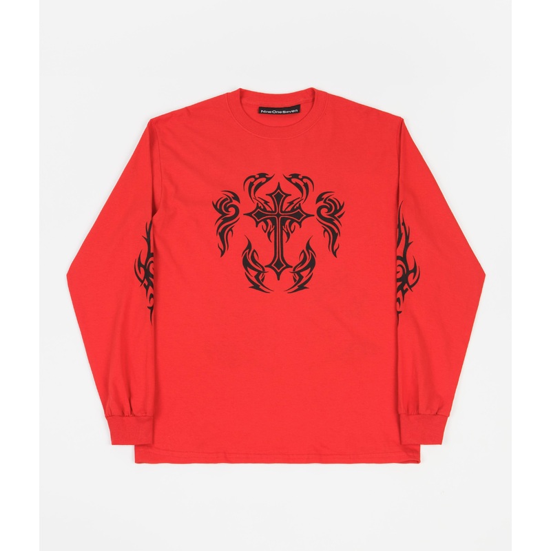 Call Me 917 Tribal Long Sleeve T-Shirt in Red. With its vibrant colouring and its tribal-inspired detailing, this long-sleeve Call Me 917 t-shirt arrives as part of the brands latest SU21 release. Tailored to a regular fitting from 100% premium-grade cotton, this 6oz tee features cuffed sleeves, a shape-retaining hemline and a classic crew neck collar thats designed to provide ample structural support to suit. Signed off with bold-black tattoo-like prints across the sleeves, cross-decaled centre chest and both above and below the Nine One Seven printed reverse.