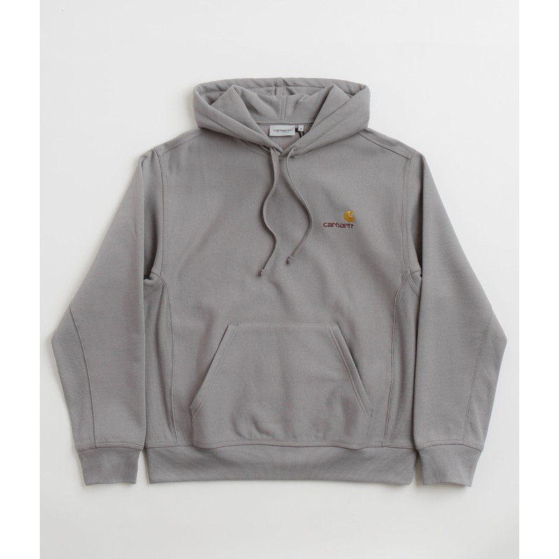 Carhartt American Script Hoodie in Yosemite. Loose fitting and made from a cotton-polyester blend, this Carhartt hoodie is designed with ribbed side panels and a drawstring hood. Featuring a kangaroo front pocket and rib knit cuffs, this grey Carhartt hoodie is finished with embroidered logo branding.