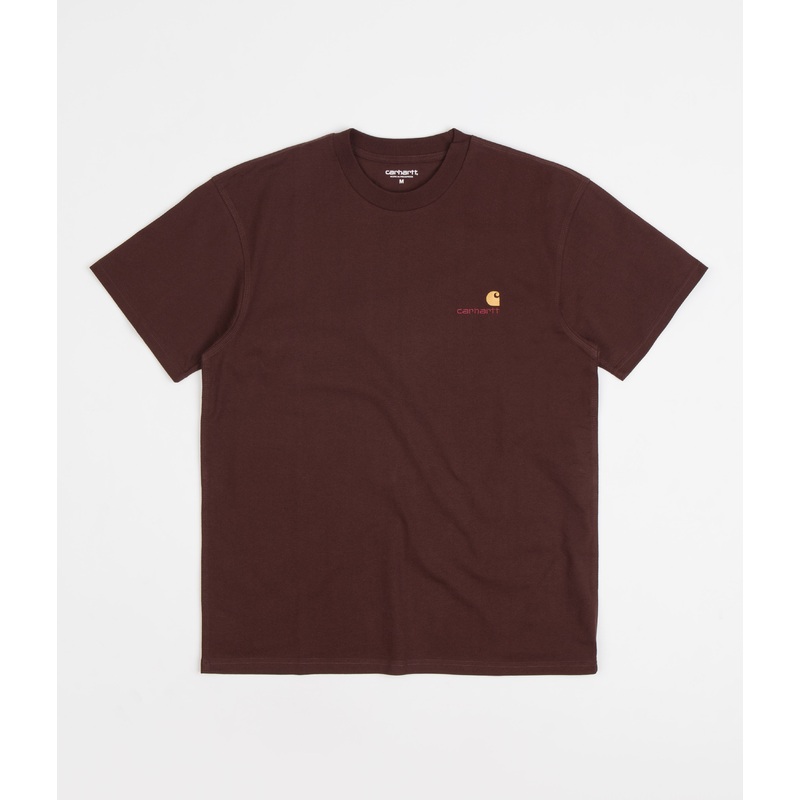 Carhartt American Script T-Shirt in Ale. Crafted from 100% organic cotton single jersey and tailored to a loose fit, this short sleeve Carhartt t-shirt arrives as a colour block staple from the brands Fall Winter 22 collection. Featuring a flexible rib knit collar, a straight cut hemline and tonal stitchings, this burgundy Carhartt t-shirt is finished with embroidered branding woven across the left chest.