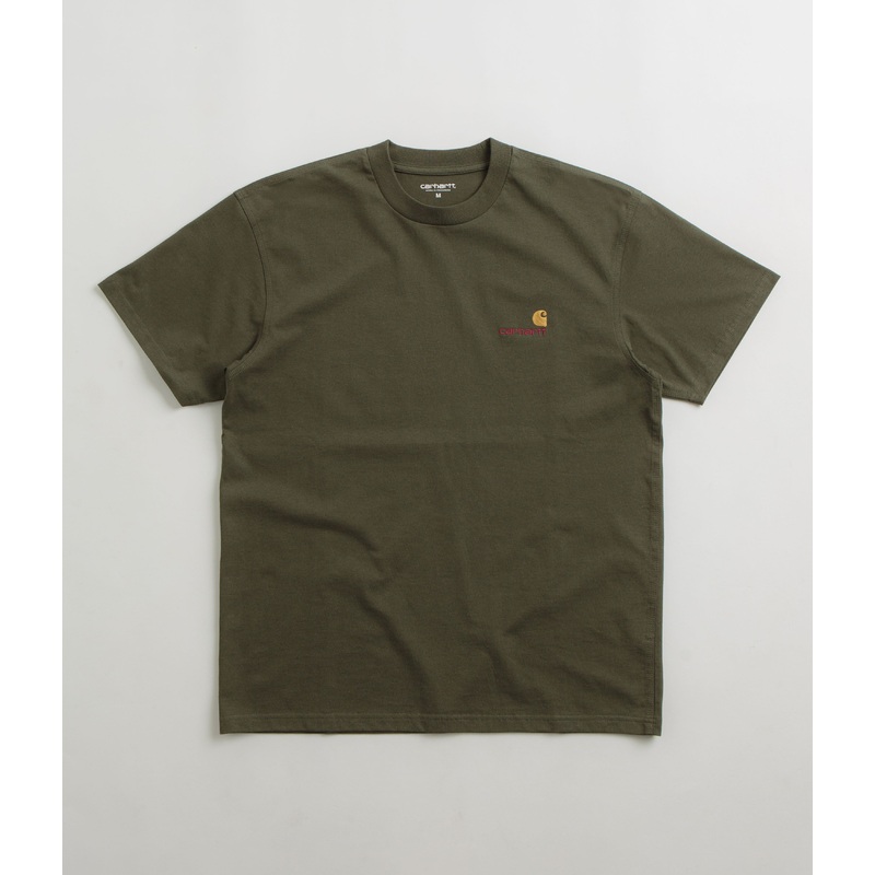 DescriptionCarhartt American Script T-ShirtCarhartt American Script T-Shirt in Plant. Seen here in a new season colourway, this loose fitting Carhartt t-shirt is made from 100% organic cotton. Featuring a flexible rib knit collar and a straight cut hem, th