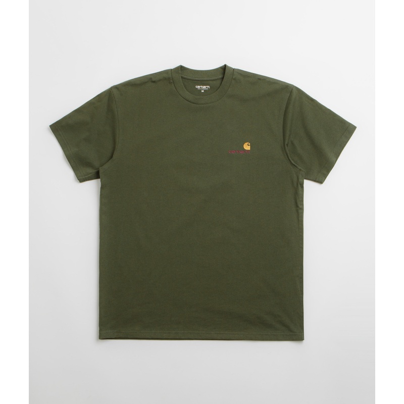 DescriptionCarhartt American Script T-ShirtCarhartt American Script T-Shirt in Tarragon. Loose fitting and made from 100% organic cotton, this block tone Carhartt t-shirt is designed with a classic crew collar and a straight cut hem. Finished in a shade of