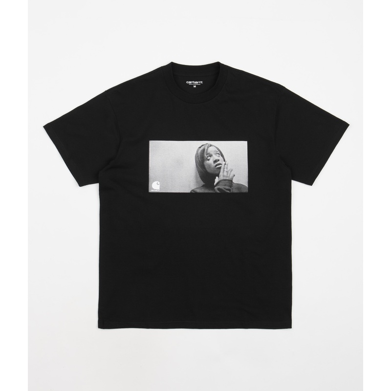 Carhartt Archive Girl T-Shirt in Black. Designed with archival imagery, this Carhartt t-shirt is made from 100% organic cotton and is tailored to a loose fitting. Featuring a classic rib knit crew collar, a straight cut hem and tonal stitched seams, this black Carhartt t-shirt is finished with a monochrome archival print displayed across the centre chest.