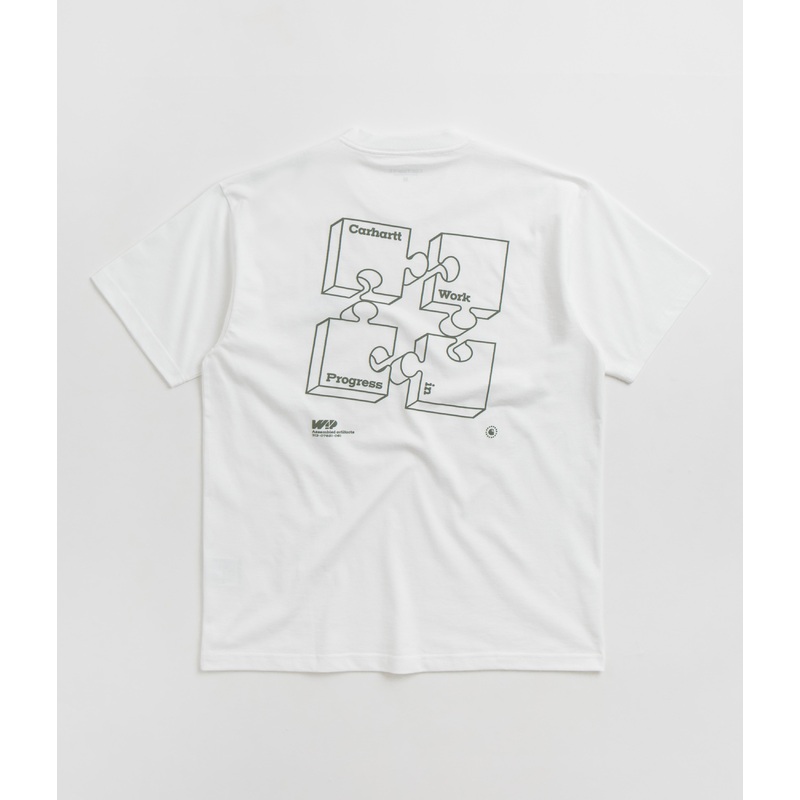 Carhartt Assemble T-Shirt in White and Smoke Green. Made from 100% organic cotton, this new season Carhartt t-shirt is designed with a flexible rib knit collar and a straight cut hem. Finished in a shade of white with screen printed left chest branding with a large puzzle themed graphic displayed across the rear.