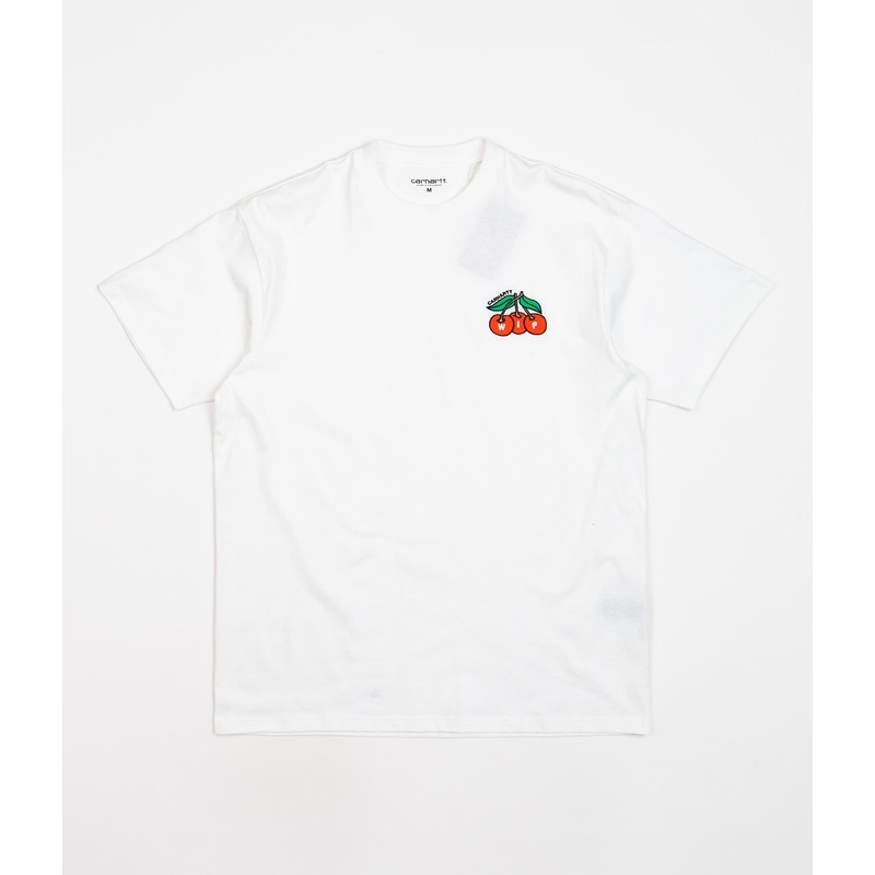 Carhartt Blush T-Shirt in White. Made from 100% organic cotton and tailored to a loose fitting, this colour block Carhartt t-shirt arrives as part of the brands latest collection. Featuring a flexible rib knit collar and a straight cut hem, this white t-shirt is finished with embroidered Carhartt WIP triple cherry left chest detailing.