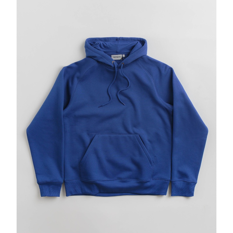 Carhartt Chase Hoodie in Acapulco and Gold. Regular fitting and made from a cotton-polyester blend this colour block Carhartt hoodie is designed with a brushed lining and a drawstring hood. Featuring ribbed cuffs, a woven elastic hem and a kangaroo front pocket, this blue Carhartt hoodie is finished with an embroidered C sleeve logo.