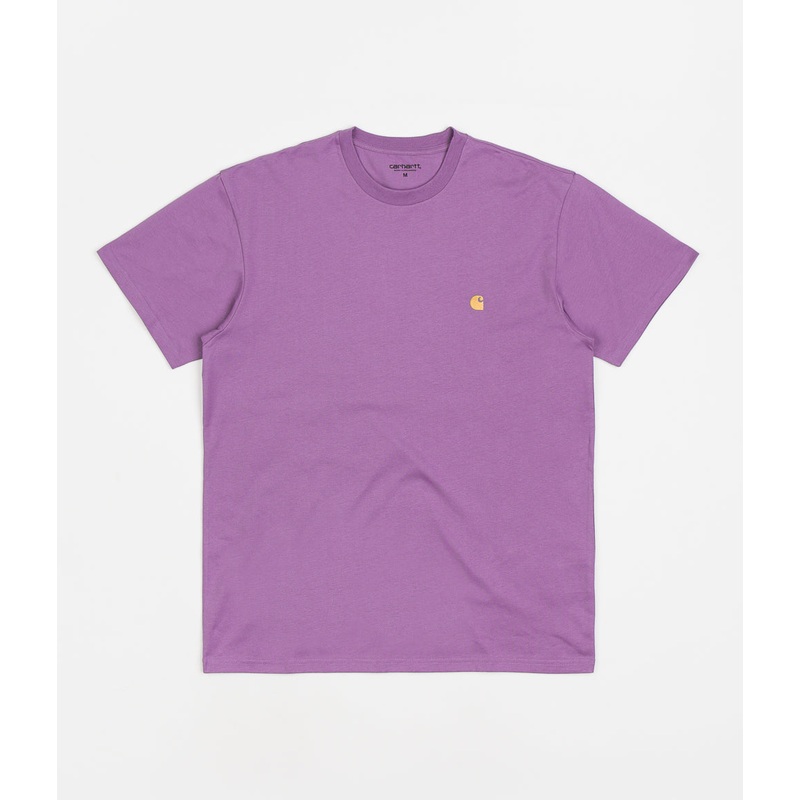 Carhartt Chase T-Shirt in Violanda and Gold. Tailored to a loose fitting from 100% cotton combed single jersey, this colour block Carhartt t-shirt features a flexible rib knit collar and a straight cut hem. Finished in a shade of purple with an embroidered gold C logo sewn across the left chest.
