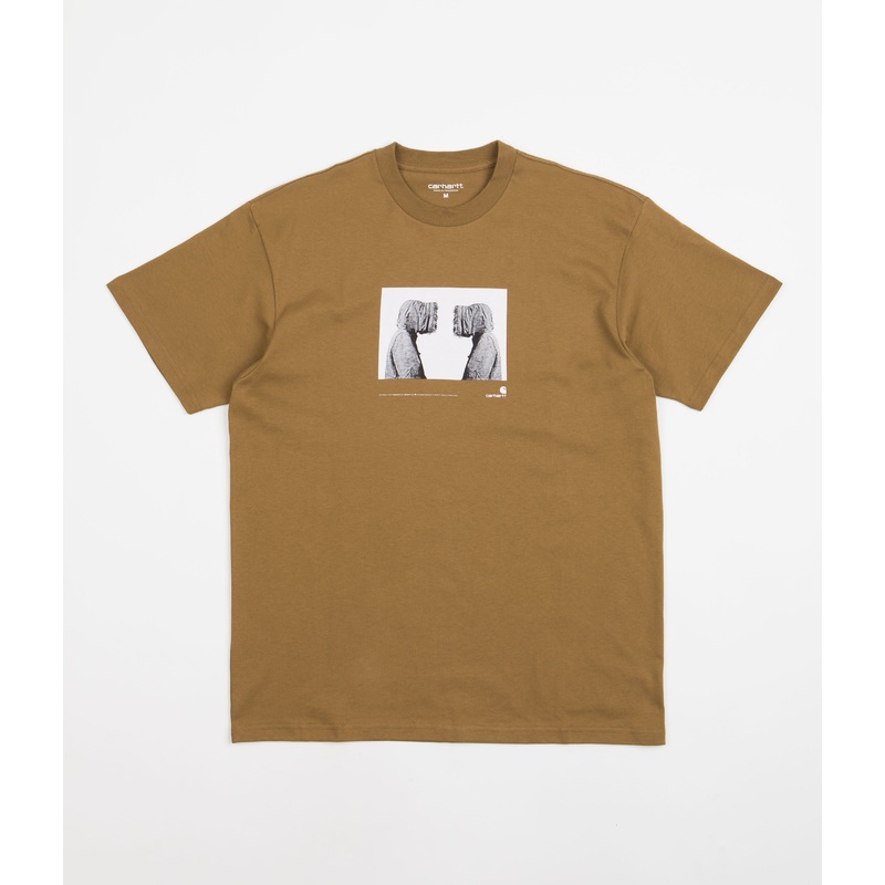 Carhartt Cold T-Shirt in Hamilton Brown. Tailored to a loose fit from 100% organic cotton single jersey, this midweight Carhartt t-shirt is styled in a classic shade of hamilton brown. Featuring a flexible crew collar and a straight cut hemline, this short sleeve t-shirt is finished with a photo-illustrative hooded jacket print across the centre of the chest.