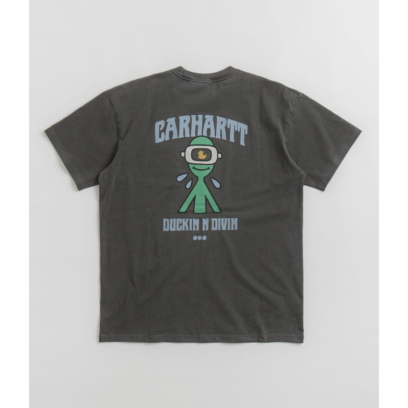 Carhartt Duckin T-Shirt in Black. Loose fitting and made from 100% cotton, this garment dyed Carhartt t-shirt arrives as part of the brands latest collection. Featuring a flexible rib knit collar and a straight cut hem, this black Carhartt t-shirt is finished with printed front and rear graphics.