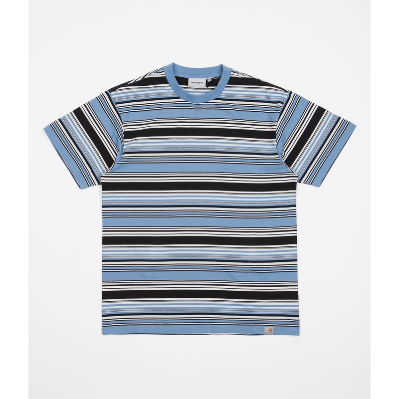 DescriptionCarhartt Lafferty T-ShirtCarhartt Lafferty T-Shirt in Lafferty Stripe and Piscine. A new season profile from the brands latest collection, this loose fitting Carhartt t-shirt is made from 100% cotton. Featuring a block tone rib knit collar, a ya