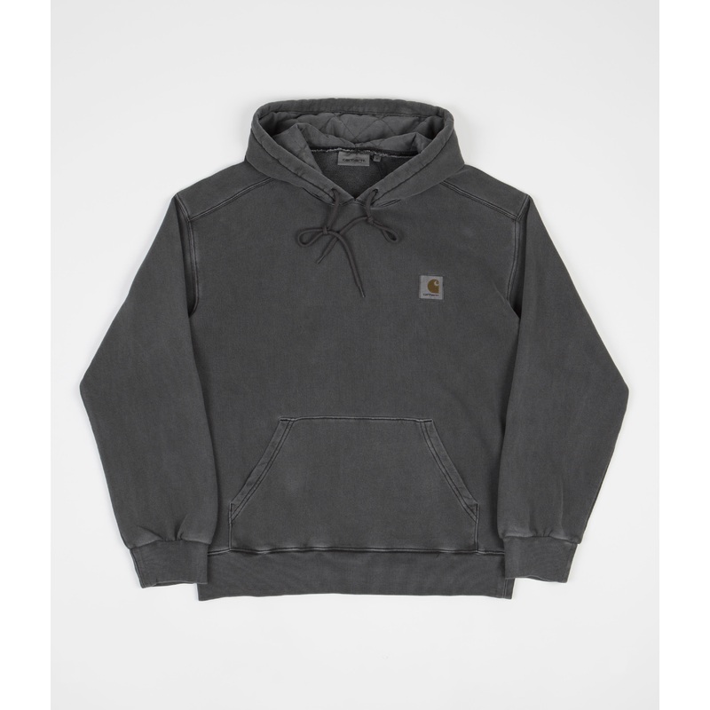 Carhartt Nelson Hoodie in Black. Tailored to a balloon style fitting from 100% cotton sweat, this Carhartt hoodie is styled with reinforced shoulder panels and an adjustable diamond quilted hood. Featuring a garment-dyed fabrication and a classic kangaroo front pocket, this black Carhartt hoodie is finished with rib knit cuffs, a woven elastic hemline and an embroidered Carhartt brand patch sewn across the left chest.