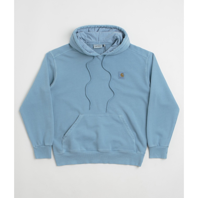 Made from 100% cotton sweat with an unbrushed finish, this Carhartt hoodie is built for everyday ease. The adjustable diamond-quilted hood adds a bit of rugged detail, while dropped shoulders and ribbed cuffs keep the fit relaxed and ready for layering. Pigment dyed in light blue, its finished with a kangaroo pocket and signature woven flag label.