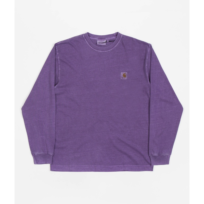 Carhartt Nelson Long Sleeve T-Shirt in Arrenga. Tailored to a loose fitting with a garment dyed fabrication, this colour block Carhartt t-shirt is made from 100% cotton single jersey. Featuring a flexible rib knit collar, ribbed cuffs and a straight cut hem, this purple Carhartt t-shirt is finished with a woven flag label sewn across the left chest.