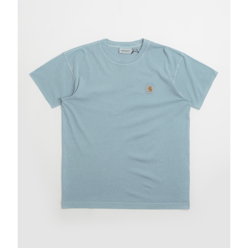 Carhartt Nelson T-Shirt in Clay Blue. Made from 100% cotton, this garment dyed Carhartt t-shirt is designed with a classic crew collar and a straight hem. Finished in light blue with woven flag label branding.