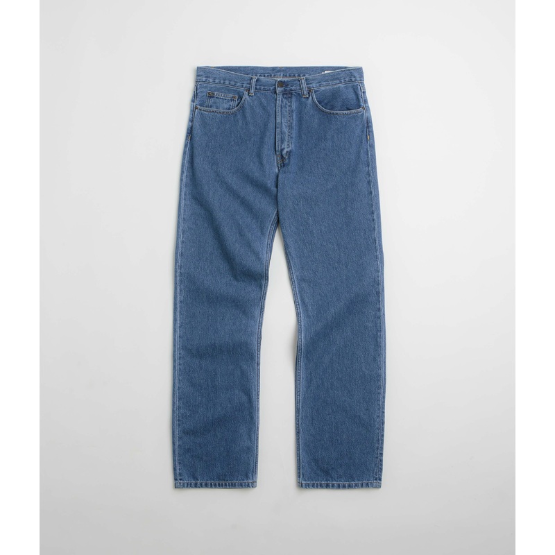 Carhartt Nolan Pants in Blue Heavy Stone Wash. Relaxed fitting with a straight leg and contrast stitching, these Carhartt pants are made from 100% cotton Marshfield denim. Featuring a belt loop waistband, a zippered fly and four pockets, these blue denim Carhartt pants are finished with a single coin pocket and woven flag label branding.
