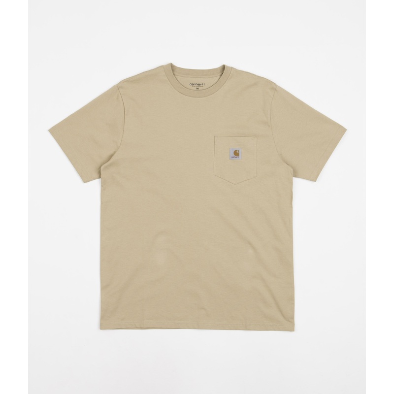 Carhartt Pocket T-Shirt in Ammonite. Part of the brands latest collection, this Carhartt t-shirt is made from 100% cotton single jersey and is tailored to a regular fitting. Featuring a classic crew collar and a reinforced hem, this khaki t-shirt is finished with a single left chest pocket and embroidered flag label detailing.