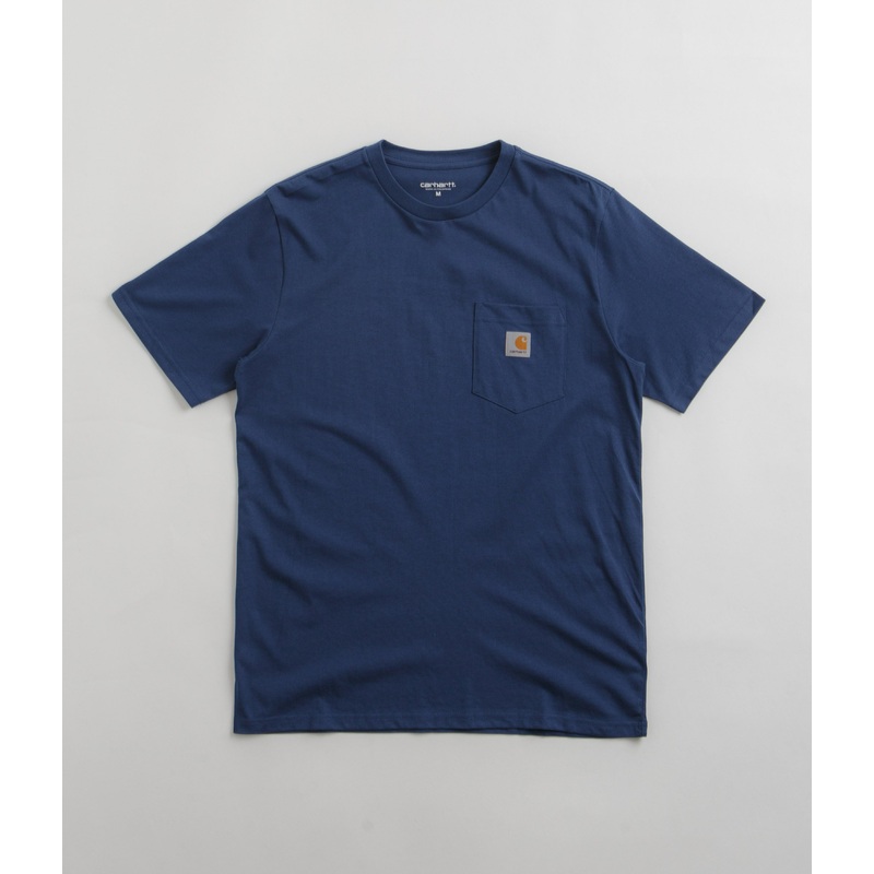 Carhartt Pocket T-Shirt in Elder and White. Made from 100% cotton, this regular fitting Carhartt t-shirt is designed with a classic crew collar and a straight cut hem. Finished in a shade of navy with a single left chest pocket and woven flag label branding.