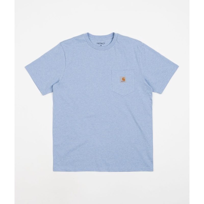 Carhartt Pocket T-Shirt in Piscine Heather. Seen here in a new season colourway, this regular fitting Carhartt t-shirt is made from 100% cotton with a flexible rib knit collar. Finished in a shade of heather blue with a straight cut hem, a single left chest pocket and with woven flag label branding.