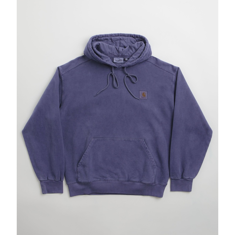 Carhartt Vista Hoodie in Aura. Balloon fitting with a brushed lining and a garment dyed construction, this Carhartt hoodie is styled with a quilted and padded hood. Featuring dropped shoulders, ribbed cuffs and a kangaroo front pockets, this balloon fitting Carhartt hoodie is finished in a shade of purple blue with overdyed flag label branding.