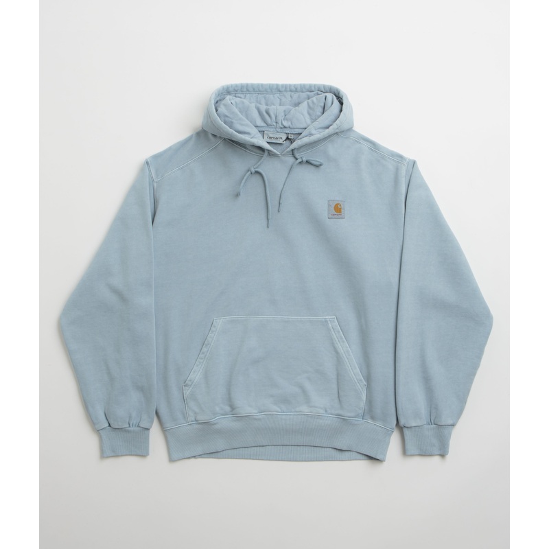 Carhartt Vista Hoodie in Dusty Ice. Tailored to a balloon fitting from 100% cotton, this garment dyed Carhartt hoodie is designed with a brushed interior and a quilted hood. Featuring dropped shoulders, ribbed cuffs and a kangaroo front pocket, this light blue Carhartt hoodie is finished with overdyed flag label branding.