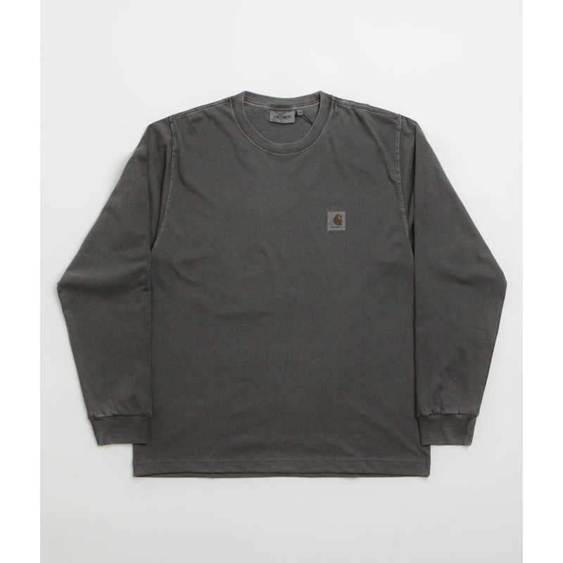 Carhartt Vista Long Sleeve T-Shirt in Graphite. Loose fitting and made from 100% cotton, this garment dyed Carhartt t-shirt is designed with a rib knit collar, relaxed shoulders and balloon-style sleeves. Finished in a shade of grey with ribbed cuffs, a straight cut hem and with overdyed flag label branding.