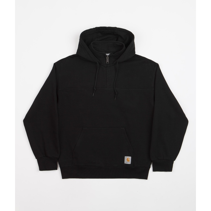 Carhartt Wade Half Zip Hoodie in Black. Tailored to a balloon fitting with a brushed interior, this black Carhartt hoodie is made from 100% cotton sweat with a heavyweight 12.3oz construction. Featuring cuffed sleeves, a woven elastic hemline and a high neckline with an integrated half-length YKK zipper, this new season Carhartt sweater also features a triple panel hood with tonal drawstring adjusters. Finished with a flag labelled dual-entry pocket and with a horizontal cutting across the upper chest.