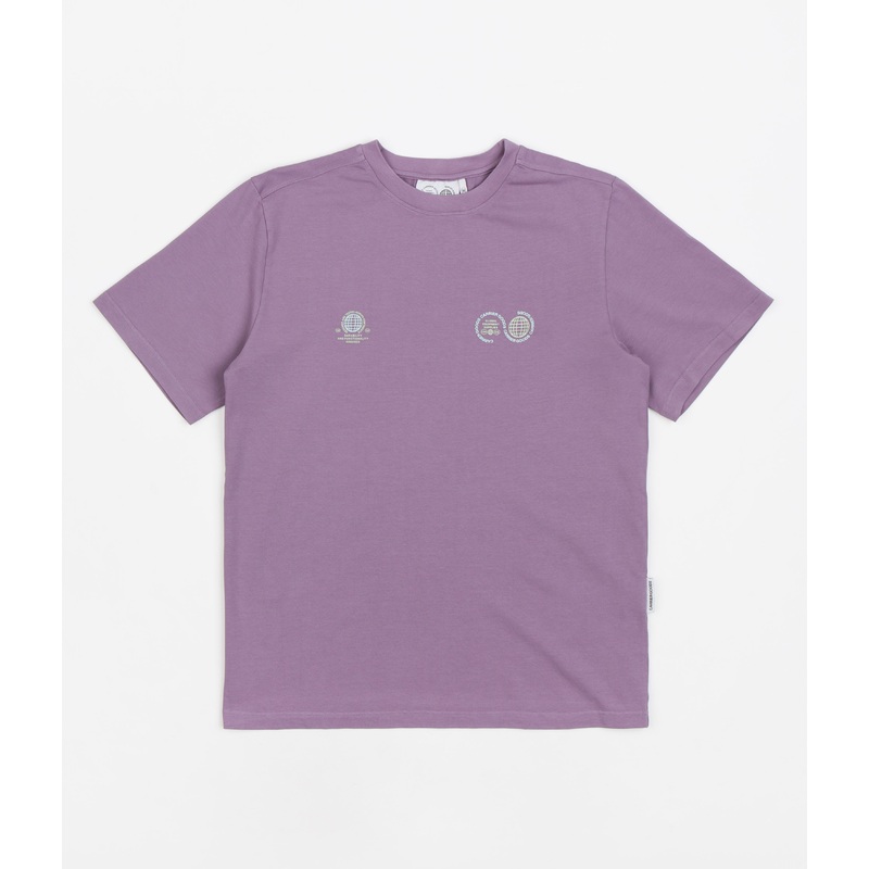 Carrier Goods Globe T-Shirt in Purple Sage. Arriving as part of the brands latest collection, this colour block Carrier Goods t-shirt is tailored to a regular fitting from 100% cotton. Featuring a flexible rib knit collar and a straight cut hem, this purple Carrier Goods t-shirt is finished with printed graphics displayed across both sides of the chest and the reverse.