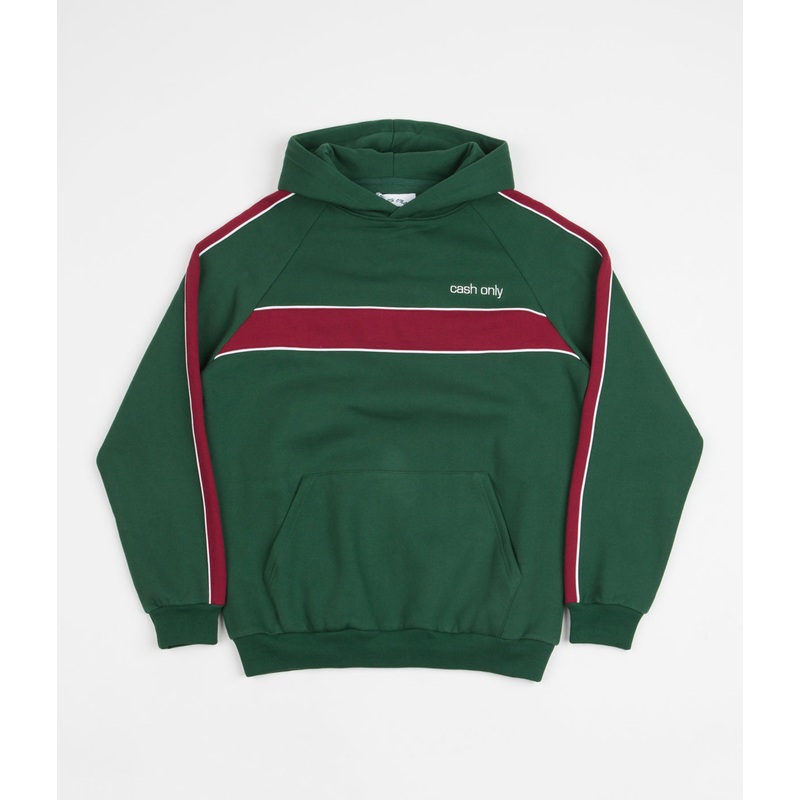 Cash Only Panel Hoodie in Forest Green and Burgundy. Heavyweight and tailored to a regular fitting, this striped Cash Only hoodie is styled with cuffed raglan sleeves. Featuring a woven elastic hemline, a split panel hood and a dual entry kangaroo pocket, this green Cash Only hoodie also features red and white piped stripes down the full length of the sleeves and across the chest. Finished with embroidered Cash Only branding sewn across the left chest.