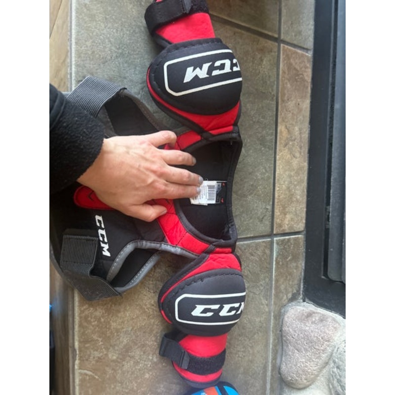 SpecificationsCategoryHockey > Protective > Neck Guards, Wrist Guards, Padded Shirts & OtherBrandCCMColor BlackAge Group YouthCondition UsedQuantity1 available|||Seller DescriptionCCM hockey chest protector youth small. Chest 23(58cm), height 34
