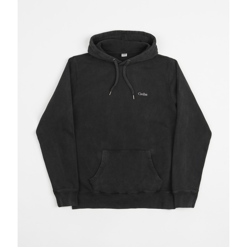 Civilist Mini Logo Hoodie in Pigment Dyed Black. Tailored to a regular fitting from 100% cotton, this black Civilist hoodie is a colour block staple from the brands latest collection. Featuring cuffed sleeves, a woven elastic hemline and a split panel hood, this Civilist hoodie also features a dual entry kangaroo pocket above the waist. Finished with tonal stitched seams and with embroidered Civilist branding sewn across the left chest.