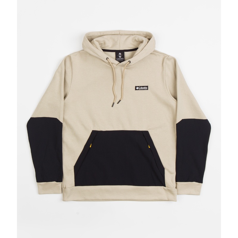 Columbia Ballistic Ridge Hoodie in Ancient Fossil and Black. Made from a cotton-polyester blend with contrasting nylon-elastane panels, this khaki coloured Columbia hoodie is tailored to a regular fitting. Featuring a drawcord hood, elasticated cuffs, a woven elastic hemline and a dual zippered kangaroo pocket, this midweight Columbia hoodie is finished with contrasting black panels and with an embroidered flag label sewn across the left chest.