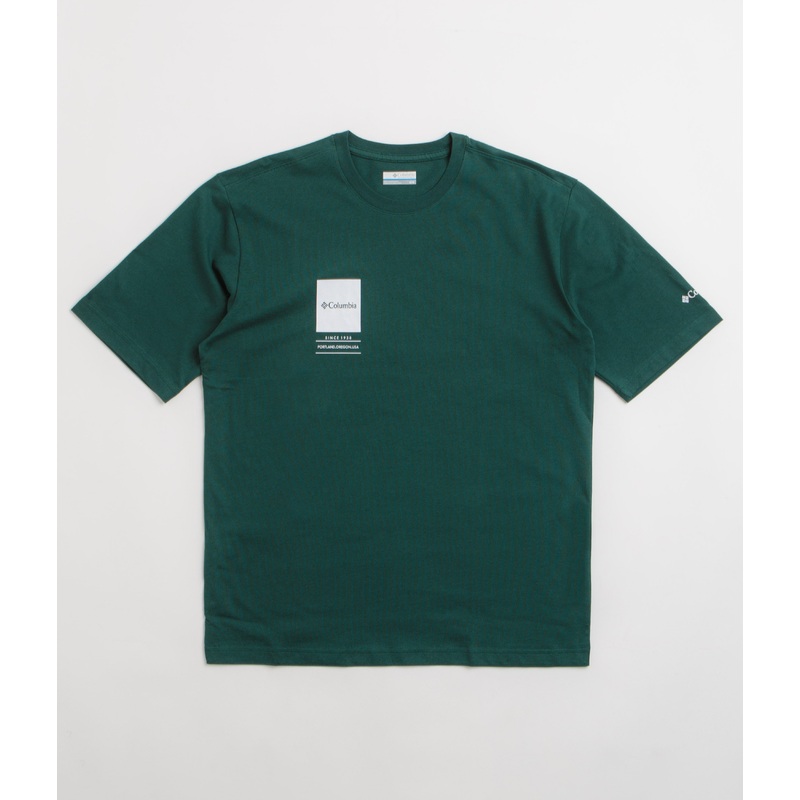 Columbia Barton Springs II Graphic T-Shirt in Midnight Teal. Regular fitting and made from 100% cotton, this colour block Columbia t-shirt is designed with an elasticated crew collar and a reinforced hem. Finished in a shade of dark green with printed right chest and left sleeve detailing.
