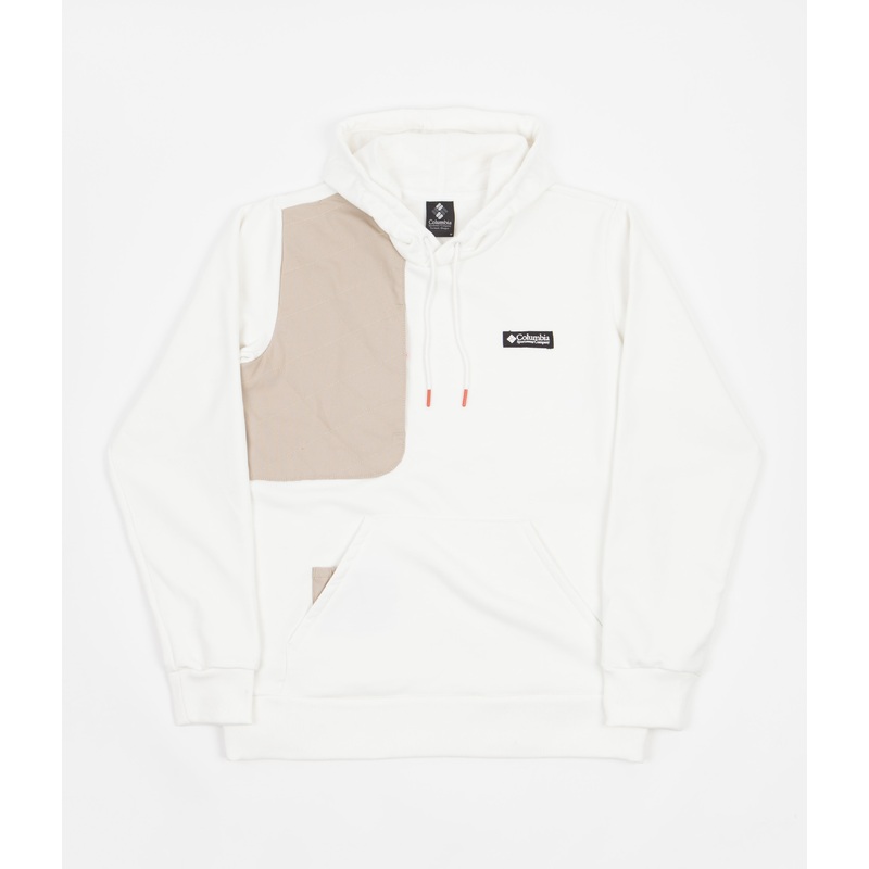 Columbia Field ROC Heavyweight Hoodie in Sea Salt and Ancient Fossil. Crafted from a blend of 60% cotton and 40% polyester with a heavyweight fleece knit composure for elevated comfort, this new season Columbia hoodie is an outdoor orientated revision of the classic sportswear silhouette. Inspired by tech-wear innovations and the brands admiration for performative design, this long sleeve layer features cuffed sleeves, a thick rib woven elastic hemline and a spacious split panel hood styled with orange aglet drawcord trims. A block tone canvas panel complements the right shoulder to conceal a single utility style stash pocket that adds to the functionality of the classic above waist kangaroo pocket and integrated pouch, whilst the embroidered Columbia left chest tab seals the silhouette with additional textured and referential depth.