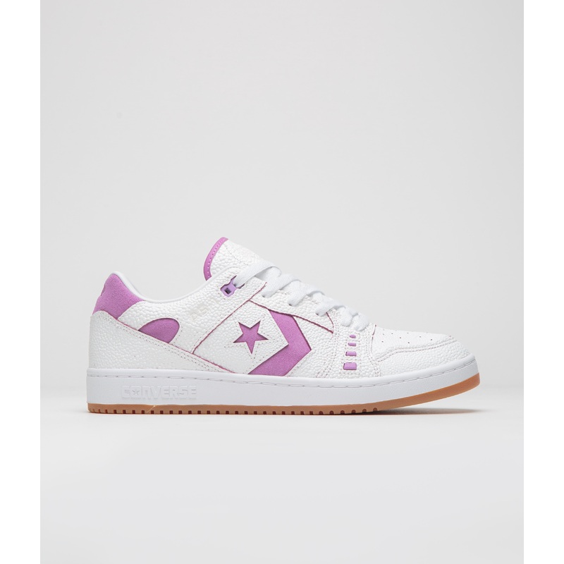 Converse AS-1 Shoes in White, Fuchsia Glow, and White. Inspired by the vibrant culture on display in Paris 2024 and part of the first ever Nike SB x Converse CONS capsule, this Converse AS-1 Pro is designed with a scale-patterned skateaway leather upper which reveals fuchsia colouring beneath. Featuring a perforated toe box, engineered GRASSHOPPER coring and rubber podded details, this white Converse AS-1 also features Chevron-Star side walls and a cushioned CX foam sockliner. Celebrating skateboarding’s individuality, this Alexis Sablone pro-model is finished with a gum rubber outsole, a classic herringbone tread, a commemorative Alexis crest and with debossed AS-1 pro model branding.