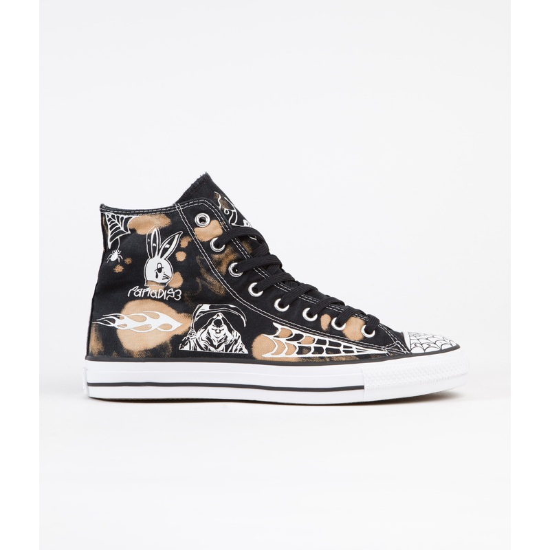 Converse CTAS Pro Hi Sean Pablo Shoes in Black, Casino and White. Designed in collaboration with team rider Sean Pablo, these creative Converse CTAS Pro His feature hand-drawn illustrations across its bleached design. Featuring rubber-backed black canvas uppers with a cushioned CX foam sockliner and a fully vulcanised construction, these high top skate shoes also feature a bright white CONS traction rubber outsole with a grippy gum rubber tread. Black rubber foxing wraps around the design to complement the auxetic toe bumper overlays and midfoot piping, whilst Paradise spider web drawings detail each white rubber toe cap. Styled with an eight eyelet lacing system, an illustrative and elasticated tongue and with a classic CTAS ankle patch, these gothic style CTAS Pro Hi sneakers are finished with all-white heel scabs, custom insoles and with printed illustrations throughout.