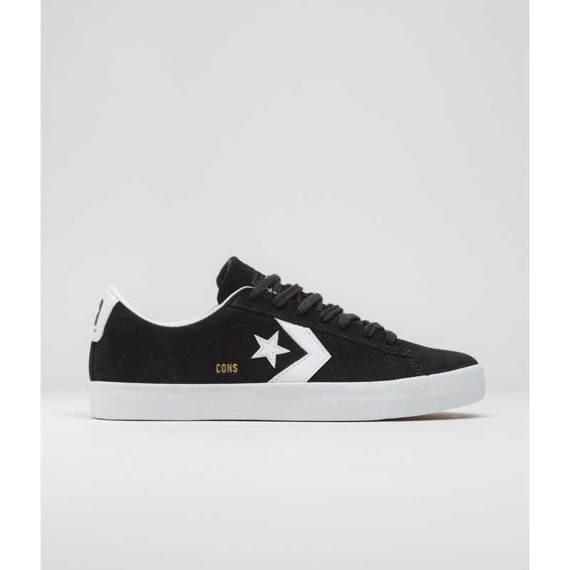Converse Pro Leather Vulcanized Pro Ox Shoes in Black and White. Arriving in a classic monochrome colourway with rubber-backed suede uppers, this Converse Cons Pro Leather Vulcanized Pro Ox is styled with engineered coring and traditional Chevron Star side walls. Featuring a vulcanised construction with a CONS Traction rubber outsole and a moulded CX foam sockliner, this black Converse Pro Ox is finished with flat laces, an elasticated and gusseted tongue, gold foil branding and with printed insoles.