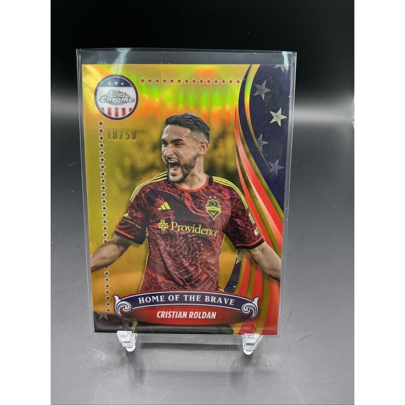 The product is a Cristian Roldan 2024 Topps Chrome MLS Home of the Brave #BR-7 GOLD trading card, featuring the player from the Seattle Sounders FC in Major League Soccer. Made of card stock, this original sports trading card is part of a set manufactured by Topps in the United States. With a limited edition of only 50 copies, this rare insert card is a valuable collectible for fans of Cristian Roldan and soccer trading cards.