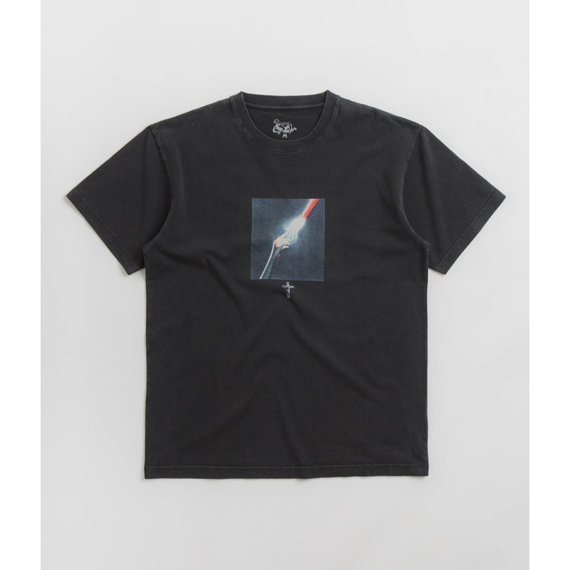 Dancer Help T-Shirt in Washed Black. Tailored to a regular fitting from 100% organic cotton, this colour block Dancer t-shirt is designed with a pigment dyed construction. Featuring a flexible rib knit collar and a straight cut hem, this washed black Dancer t-shirt is finished with a digital centre chest print.