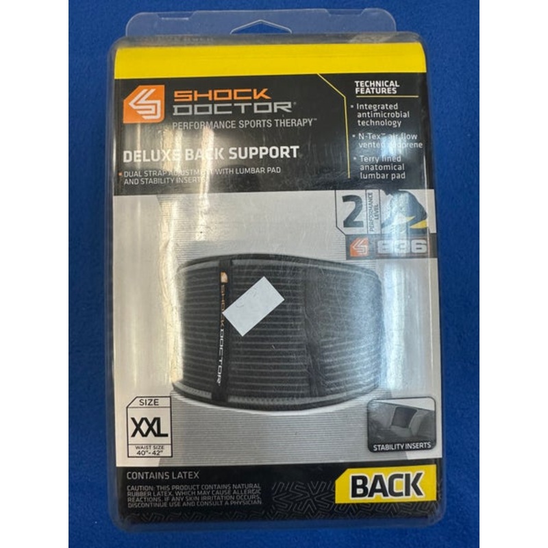 SpecificationsCategoryHockey > Protective > Neck Guards, Wrist Guards, Padded Shirts & OtherBrandShock DoctorCondition NewColor BlackAge Group SeniorQuantity1 available|||Seller DescriptionDeluxe XXL Back brace senior new see pictures for sizing