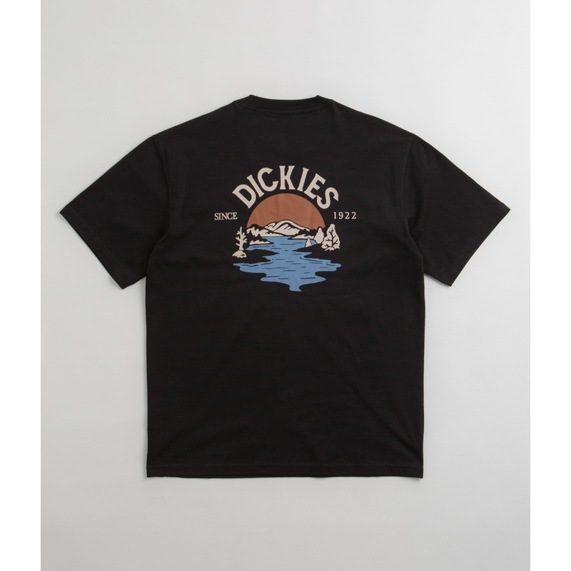 Dickies Beach T-Shirt in Black. Made from 100% cotton, this new season Dickies t-shirt is tailored to a relaxed fit. Featuring a rib knit collar and a flag labelled hem, this black Dickies t-shirt is finished with printed front and rear graphics.