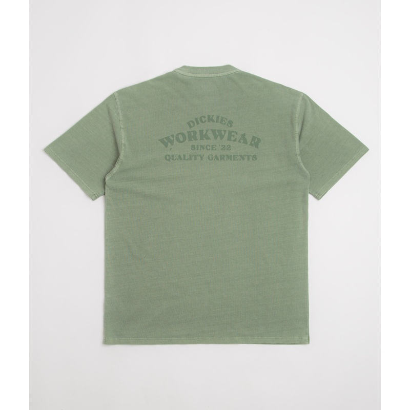 DescriptionDickies Christiana T-ShirtDickies Christiana T-Shirt in Sea Spray. Made from 100% cotton, this garment dyed Dickies t-shirt is designed with a classic crew collar. Relaxed fitting and finished in green with printed front and rear graphics.Produc