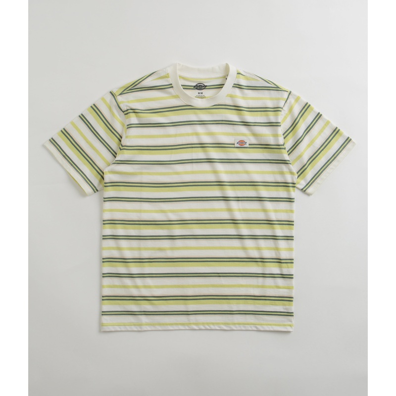 Dickies Glade Spring T-Shirt in Cloud. Relaxed fitting with a yarn-dyed construction, this Dickies t-shirt is made from 100% cotton. Featuring a colour block crew collar and a reinforced hem, this green striped Dickies t-shirt is finished with woven flag label branding.