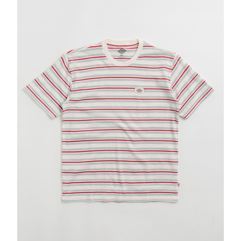 Dickies Lewistown Stripe T-Shirt in Egret. Designed with an all-over striped pattern, this relaxed fitting Dickies t-shirt is made from 100% cotton. Featuring a rib knit collar and a flag labelled hem, this white Dickies t-shirt is finished with printed logo branding.