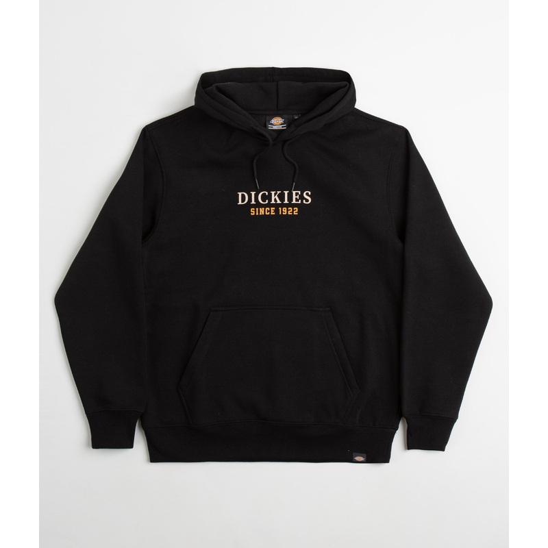 Dickies Park Hoodie in Black. Tailored to a relaxed fitting from a cotton-polyester blend, this colour block Dickies hoodie is styled with a classic drawstring hood and rib knit cuffs. Featuring a woven elastic hem and a dual-entry front pocket, this black Dickies hoodie is finished with screen printed Dickies Since 1992 branding displayed across the centre chest.