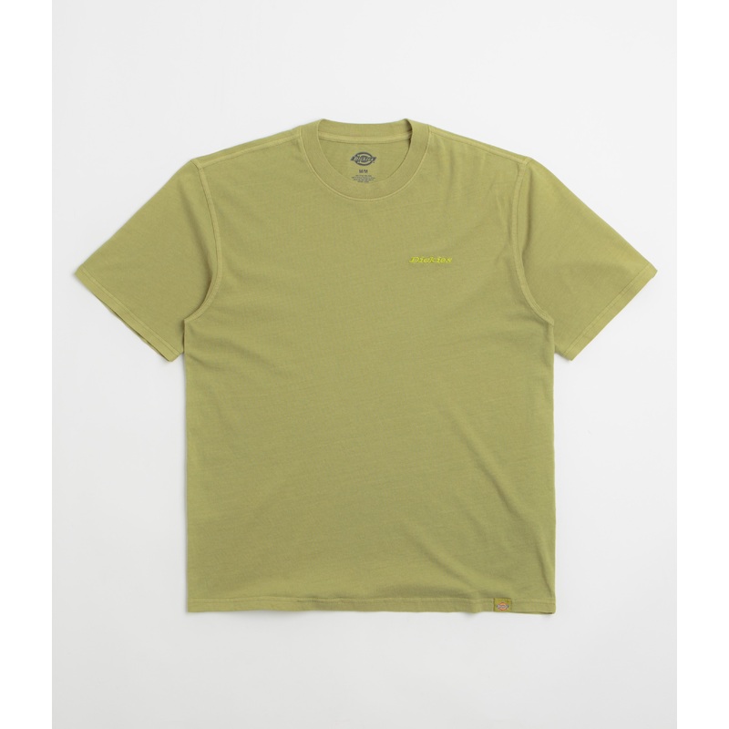 Dickies Plentywood T-Shirt in Evergreen Sprig. Designed with a double-dyed acid wash, this relaxed fitting Dickies t-shirt is made from 100% cotton. Finished in green with a classic crew collar, a flag labelled hem and a printed chest logo.