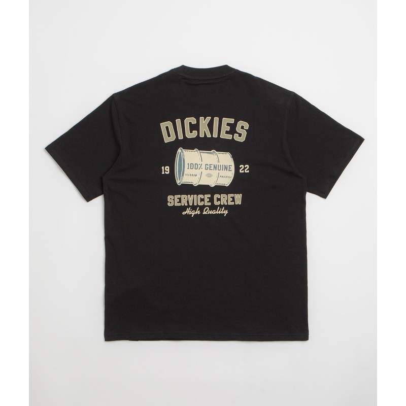 Dickies Service Crew T-Shirt in Black. Relaxed fitting and made from 100% cotton, this Dickies t-shirt is designed with a rib knit collar and a straight cut hem. Finished in black with printed graphics and flag label branding.