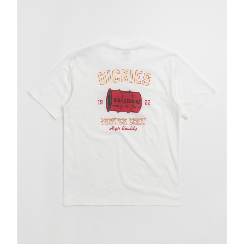 DescriptionDickies Service Crew T-ShirtDickies Service Crew T-Shirt in White. Relaxed fitting and made from 100% cotton, this block tone Dickies t-shirt is designed with a flexible rib knit collar and a reinforced hem. Finished in white with printed graphi