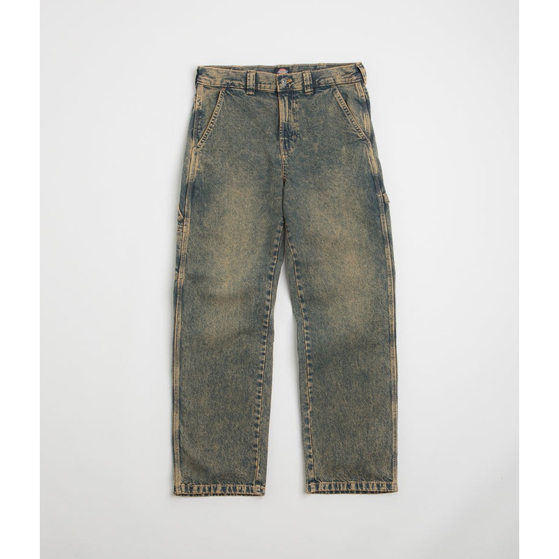 Dickies Stevensville Carpenter Jeans in Yellow Fade Indigo. Loose fitting and made from 100% cotton denim, these Dickies jeans are designed with a tinted wash and a belt loop waist. Featuring a zippered fly, two side pockets, two rear pockets and dual tool pockets, these yellow blue Dickies jeans are finished with a woven hammer loop and woven flag label branding.